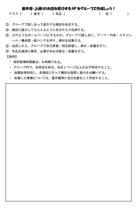 | 1.授業の趣旨についてオリエンテーションを行う。 2.商店決定と作成のルール。 ・各班、4〜5人で構成すること。 ・担当する商店が、原則的に現時点でホームページを立ち上げていないこと。 ・他の班とだぶらないように調整すること。 ・自分たちで商店と交渉、趣旨を説明して、協力してもらうこと。 ・必要な情報は自分たちで収集・判断・表現・処理をすること。 ・各班人数以上のページを構成し、1人1ページ以上担当すること。 オリエンテーションの後は、シート(図2)の説明に従って、各班で、目的・内容を決め、各自の担当・スケジュールを立てる。次に『Webページ』の構成図・絵コンテを作り、それに基づいて調査・取材・素材集めを行い、パソコンで『Webページ』を作成する。作成後は、作動確認・評価・改善を行い完成とする。授業時間数は、8時間を予定。 |