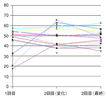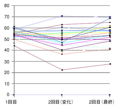 グラフから有利グループでは評価が次第にバラバラになって行くのが分かります。グループの平均値と標準偏差を調べてみると、有利グループは(53.81, 3.82)→(50.30, 9.77)→(53.50, 9.14),不利グループは(44.30,12.24)→(50.16,10.22)→(48.14, 7.92)となっています。2つのグループの標準偏差が近づいて行くことも分かります。このことは連続評価によって、家庭のインフラや授業以前のスキルの差がかなり軽減されつつあることを物語っているように思いますが、いかがでしょうか? |