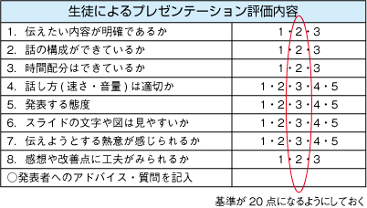 今回は,一人ひとりの発表の姿勢やスライド内容に関して重点的に評価を行った。また,生徒に対しても他者を評価することで,良い部分を見つけることができていた。生徒による評価では,大きな声が出ている生徒の評価が高かった。 今年度は,全員に対して一人2分,評価時間を1分としたためかなりの時間がかかった。また,同じクラス内で同一企業の発表が多かったため多少飽きる生徒が出てきた。 |