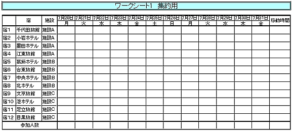 (3)資料及びワークシート,レポートの配付 課題を伝えたら,各グループで班長を決め,班長が今回の課題を解決するために必要な資料を教員より受け取る。各グループに渡される資料及びワークシートは以下の6枚である。 資料(表1) 合宿用のスポーツ施設と宿の候補 資料(表2) 施設と空き状況と費用 資料(表3) 部員の都合(45名分の部員名簿) 資料(表4) 宿と空き状況と費用 ワークシート1 集約用