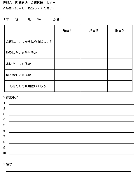 各クラス4人一組になって,チーム対抗戦として授業を進めていく。グループ分けは生徒の自由に決めてしまうとうまく行かない場合が多いので,教員がコンピュータ室の近くの座席どうし(出席番号順の座席)で4人組を決めている。 (2)課題 あなたは,部活動の合宿先を確保する責任者になりました。合宿先を確保する手順を決め,下級生にその手順を伝えて作業させます。 <条件>