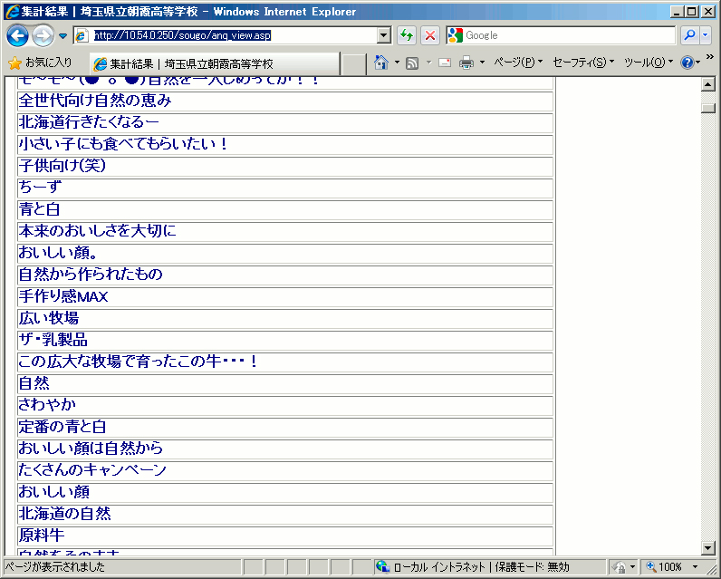 (2)授業の流れ [1] コンセプトとは何か? CMの映像を見せ,コンセプトという言葉・考え方を説明します。 [2] コンセプトを考えよう 1 専門学科を持つなどの特色のある高校のWebページを見せ,そのWebページのコンセプトを考えさせて言葉にさせます。回答方法はWebを利用したアンケートシステムを利用します。アンケートシステム上のリンクをクリックすることによって,高校のWebページが個々の画面に表示されます。生徒はそのWebページを見て,アンケートシステムに回答します。全員が回答し終わったら,集計結果を中間モニターに表示して生徒の回答を確認します。ここでは,特色のある学校のWebページを利用したため,生徒の回答は概ね似たような表現のものが並びました。 [3] コンセプトを考えよう 2 乳製品メーカー数社のWebページを見せ,それぞれのWebページのコンセプトを考えて言葉にさせ,アンケートシステムに回答させます。全員が回答し終わるまで待ちます。 [4] コンセプトを反映させる方法を考えよう コンセプトになりうる言葉を提示し,その言葉を反映したWebページにするための工夫を3つずつ挙げ,回答させます。今年度は言葉として「暖かい」,「高級感」,「希望」を取り上げました。 [5] コンセプトを検討しよう 4人1組のグループをつくり,「コンセプトを考えよう2」で取り上げたWebページから1つ,「コンセプトを反映する方法を考えよう」で取り上げた言葉から1つを選んで,グループ内で意見交換を行い,グループとしての結論をまとめます。相談するときには,アンケートの回答結果を参考にしてもよいものとしました。また,グループの結論には必ず理由を明確にするように求めました。 [6] 発表 グループで検討した結果を各グループの代表が発表します。 (3)授業を実践したときの様子