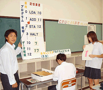 この仮想コンピュータの処理の仕組みが理解できたかどうかの評価に,図2のように生徒が3名ずつグループを作り,各ロボットの役割を演じるロールプレイングを行う.プログラムカウンタの役は,司会役がボードに張り付けられた命令の札を読み上げる瞬間を注意しながら,読み上げられるとすぐ,自分の持つ日めくり式の数字札をめくって,次の実行を示す.命令レジスタの司会役は,プログラムカウンタに指示された番地のプログラム領域のボード上の札に書かれた命令や,データ領域の数値を指示棒で示しながら読み上げ,実行役に正確に伝える.実行役は演算レジスタとして,ペンと白紙の計算用紙の入ったトレイとゴミ箱を準備している.司会役の指示に従って,計算過程を口頭で伝えながら,計算を行う.演算レジスタに記憶されたままになる数値は,紙に書いてトレイにしまい,不要になった数値は,用紙とともにゴミ箱に捨てる.適宜役割を交代することにより,理解を深める.