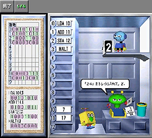 仮想コンピュータのシミュレーション教材では,図1のようにプログラムカウンタ,命令レジスタ,演算レジスタが,それぞれ進行役,司会役,実行役のロボットに扮する.進行役のプログラムカウンタが指示する番地へ司会役ロボットが出向き,プログラム領域の命令を解読したり,データ領域のデータを読み上げたりして,実行役ロボットに指示を出す.この指示に基づいて,実行役ロボットは計算を行い結果を返す.各ロボットの行動は,実際のコンピュータの動作を忠実に再現しており,コンピュータの処理の仕組みをイメージ化するのに適している.また各ロボットの働きは,そのまま生徒が役割を演じることが可能で,体験参加型の授業展開がしやすいようになっている.
