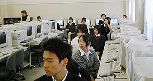 平成12年度,機種更新等によってパソコン60台が導入され,校内LAN,インターネット接続が一気に進んだ.情報教育を特色のひとつとして推進してきた本校は,これを機会に平成15年度から必修化される新教科「情報」を2年先行して必修化に踏み切った.2コマ連続の授業展開が理想であったが,現行カリキュラムの変更を小さくするため,1年生1単位,2年生1単位の分割履修の形で設置した(平成15年度からは1年生で2単位を予定).