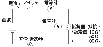 なお,実験には,電流計,電圧計,ダイアル型可変抵抗器,すべり抵抗器,直流安定化電源,スイッチなど,各種実験機器を実際に使用する.