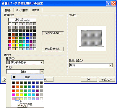 | [線種とページ罫線と網かけの設定]ダイアログボックスの[網かけ]タブでは,網かけの種類や色を選んで指定することができます。 |