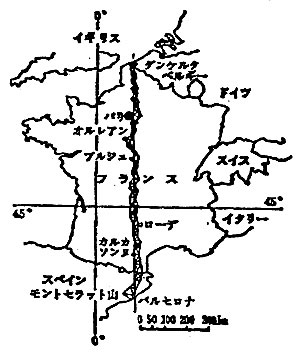 子午線の測量にはダンケルクからバルセロナまでの距離が選ばれ,ドランブルとメシェンらがその任にあたった。時あたかもフランス革命最中の1792年,彼らは二隊に分かれ,パリをあとに測量の旅へと出発した。持つものは,ボルダの発明した経緯儀,信号灯などの測量器具一式と,身の安全を保証するはずの“お墨付”である。中でも自慢の種は,1秒の精度を誇る最新式の経緯儀であった。