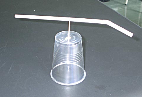 | ・摩擦電気、帯電…「塩ビ管と荷造り用テープの電気クラゲ」 荷造り用テープ30〜40cmの片方に固く結び目を作り、残りを細かく裂いてクラゲを作る。塩ビ管とクラゲの両方をティッシュペーパーでこすり帯電させて、電気的な反発力により塩ビ管の上にクラゲを浮かせる。 これは、今ではあちこちで紹介されているが、初めて見るものには意外性を感じるものである。塩化ビニルもポリエチレン(荷造りテープ)も紙でこすると負に帯電する。単純な実験だが電気分野の導入、興味付けにいい。「クラゲ」を浮かせるのには、出来るだけ軽く作り、よく帯電させねばならず、試行錯誤が必要である。 ・静電誘導、誘電分極…「帯電ストローの実験」 これも、単純だが筆者の授業にはなくてはならないものである。以前、大阪の山田善春先生が紹介していたのを見てそれ以来使わせてもらっている。つまようじなどを立てた先に帯電したストローを方位磁針のように乗せて回転するようにしただけのものである。(写真1)これに、同種の電気に帯電したストロー、摩擦電気の相手側の紙、導体のドライバー、帯電していない消しゴム、指などいろいろなものを近づけながら話を進めると、スムーズに静電誘導や誘電分極の話が出来てよい。この後「箔検電気」を用いて少し複雑な電荷の動きの理解につなげている。
