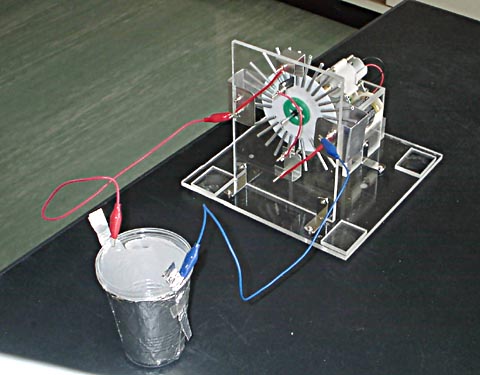 | 2.では授業で行っているお手軽実験を紹介したが、あまり目新しいものはないので、最後に現在試みている誘導型静電発電機を紹介する。誘導型の発電機ではウィムスハースト型の発電機があるが、教室に持ち運び出来るくらいで単純な形のものを自作できないかと、A.D.ムーア著「静電気の話」(河出書房新社)を参考にディロッド型の誘導型静電発電機を作製してみた。 回転板に取り付けられた導体棒が、ある位置で誘導され、電荷を持った部分だけが離れて次の集電部分に接触して電荷を放出し、集電部分とつながった誘導板がさらに新たな電荷を誘導する原理である。(原理図と写真2)基本構造は市販のアクリル板で、導体部分はアルミ板、導体棒は細いアルミパイプ、導体棒と接触をする部分には導体ゴムで作ったブラシを用いた。模型用モーターとギアで円板を回転させている。今のところ、発電量も小さく(1〜2mmの間隔で火花が見られる程度)まだ演示実験等で使用できるまでには至っていない。より手軽な材料で安定した発電機が出来ないか、試行錯誤中である。
