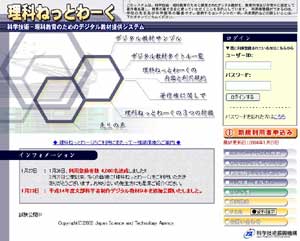 | JST(科学技術振興機構)が運営している「理科ねっとわーく」という無料のサイトがあり、小・中・高等学校の教師であれば誰でも上記URLから入会できます。 このサイトは小中高の理科(物化生地)の一斉授業においてインターネットに接続して利用することを目指しており、資料映像・実験映像・生徒に説明するためのCGなどが豊富にそろっています。教室でインターネット回線を利用できない場合、CDR版を無料で送付してくれます。 |