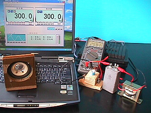 (3) 交流回路の実験 「発音」の出力を20〔W〕のアンプで増幅し、L出力を周波数可変の交流電源、R出力をスピーカーにつないで音を出し、周波数が変化していることを印象づけます。 [1] コンデンサーのリアクタンス 図5について:C =25〔μF〕、L =0.1〔H〕(ともに素子の表示値)、f =300〔Hz〕のときに電流は最大値259.1〔mA〕になりました。電流計の下にある黒い箱がアンプです。