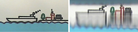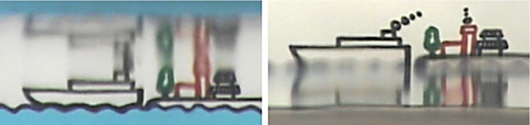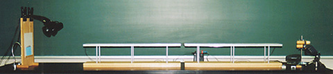 | (1) 空気の温度差で作る蜃気楼発生装置 本装置はニクロム線をアルミ板で挟み,その板を熱くすることで板の直下に上暖下冷,直上に上冷下暖の空気層を作り出す(図2)。このとき,板の直下から他端の像を見ると上方に伸び,また装置の下部に風を送ることで倒立する上位蜃気楼が観察できる(図3−1,3−2)。一方,板の直上から他端を見ると,下位蜃気楼が観察できる(図4)。