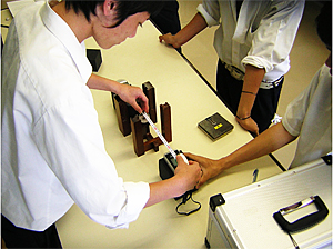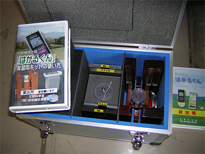 その際、日本科学技術振興財団のていねいな対応のおかげで、「実習用キット」(写真1)の存在を知り、初心者の私は迷わず「はかるくん」と「実習用キット」の借入れを申し込んだ。「実習用キット」とは、後に詳しく述べる放射線の性質を知る上で基礎となる実験用具一式(γ線の線源Cs-137や遮へい材など)である。キット1組につき、「はかるくん」は4台あると効率よくその後の実習を進められる。初心者の私は、申し込む時点でそのこと を知らなかったので、「はかるくん」3台、「実習用キット」3組という妙な組み合わせで申し込んでしまった。しつこいですが、これから初めて借入れを考えている方のために、キット1組につき「はかるくん」4台がベストであることを強調しておきたい。 「はかるくん」の取り扱い方や「実習キット」の使い方については、解説ビデオを見ることで、高校生にとっては十分理解できるようであった。私から生徒に改めて説明する必要は一切なかった。小学生、中学生でも十分だと思われるていねいなビデオだった。なお、これらのビデオについても借入れ申込書の中で、希望の有無を記入するところがあり、もちろん私は申し込んでいた。 |