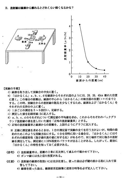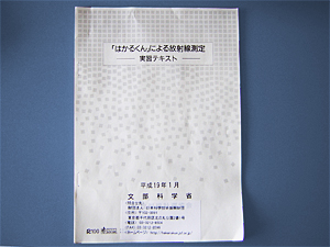 実習テキストでは、ここまでの内容を11ページにわたり解説している。P12からは以下の具体的な実習用キットを用いた実験のための実験プリント形式でテキストが構成されていた。 実験(1)身近な場所の放射線を測ってみよう これらの実験は、放射線の基本的な性質を知る上で有効な実験であるし、「はかるくん」初心者の私や生徒にとって、このテキストにある実験をやり遂げるだけでも十分に満足のいくものであった。 |