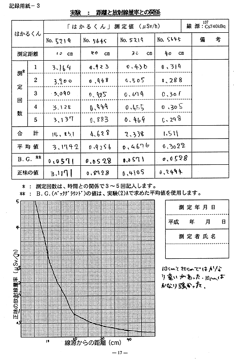 <生徒の感想> このように、実験の進め方から記録の仕方まで、詳細にわたって実験プリント形式でテキストが構成されており、大変便利なものであった。生徒もテキストに従い、スムーズに実験をこなすことができた。また、上の例以外の実験結果についても、しっかりと傾向が現れ、放射線の性質を知る上で実に分かりやすい実験であった。 |