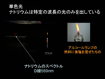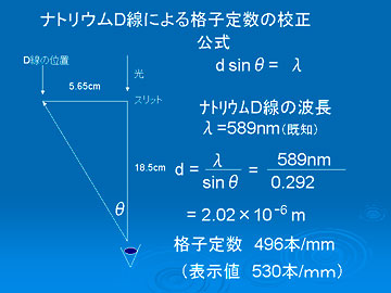 | 最近の蛍光灯は,赤,緑,青の光の三原色を出すものが増えている。これは線スペクトルが観察しやすいので,製作した簡易分光器を用いて,3色タイプ蛍光灯のスペクトルを観察し,赤,緑,青の輝線の波長を測定する生徒実験を行った。 −準備するもの− 電卓,アルコールランプ,食塩,3色タイプ蛍光灯 (1) ナトリウムD線による格子定数Dの補正 回折格子は温度や湿度により伸び縮みするので,ナトリウムのD線のスペクトル約589nmを簡易分光器で測定し,格子定数を補正する。