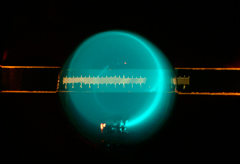 電界による加速によって電子のもつ運動エネルギーや速さを計算させたり,電子の速さ(加速電圧)によって円運動の軌道半径が大きくなることや,磁界の強さ(磁束密度)によって軌道半径が小さくなることを示したりできるので,エレクトロニクスの演示実験として,“e/m 測定実験器”を大切にしてきたのだが,生徒たちの反応は今ひとつということが多くなってきた。そこで,円運動の周期が速さによらず一定になることを利用して,原子核や素粒子の研究に欠くことのできない“サイクロトロン”がつくられていることを発展学習するが,興味を示す者は少なくなってきた(粒子加速器“サイクロトロン”が身近でなく,想像しにくいためか)。 |
