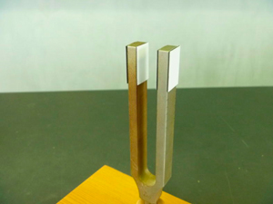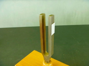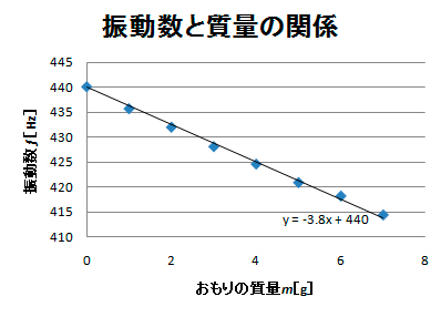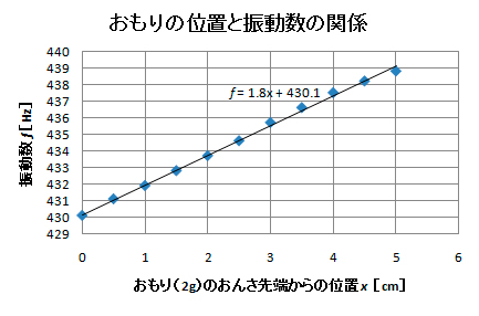 【考 察】 上の表やグラフより,おもりの位置がおんさ先端から離れるに従って,おんさの振動数が増加していくことがわかった。ただし,x=4〜5cm 付近から,徐々に勾配が緩やかになってきているのがわかる。つまり,おんさの根本に近づくにつれて,おんさの振動に対するおもりの質量の影響が減少し,最終的には元の振動数440Hzに収束していくことがわかる。 |