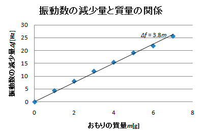 【考 察】 おもりを付けたときのおんさの振動数は,おんさの先端からの位置を同じにすると,上の4つのパターンにおいては変化がなかった。このことから,おんさの先端からのおもりの位置が変わらなければ,おもりをつける場所と振動数は無関係であることがわかった。 II おんさの振動数とおもりの質量の関係