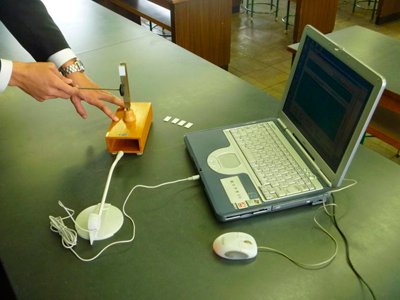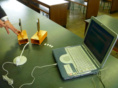 答えは当然404Hzであるし,その原因は,輪ゴムを付けたことによりおんさの質量が変化し,振動数に影響を及ぼしたことにあると容易に想像できる。しかし,そのことを定量的に確かめようとすると,まずは,精度良く振動数を測定できる計測システムを必要とするため,なかなか容易なことではない。そこで,使いやすく精度の高いソフトを探していたところ,啓林館のHP上の「物理授業実践記録」(2004)にあった[Webソフトを用いた音波と交流の授業−JST「理科ねっとわーく」の利用−](神奈川県立厚木高等学校 水上慶文先生)の中で紹介されているWebソフト「振駆郎」(提供元:科学技術振興機構 理科ねっとわーく)を見つけ,生徒実験および課題研究に利用することにした。 |