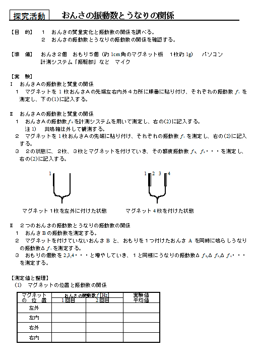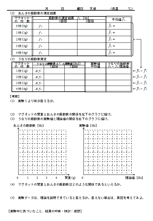 【考 察】 この実験結果より,2つのおんさによるうなりの振動数は,それぞれのおんさの振動数の差になっていることがほぼわかった。ただし,振駆郎から得られるグラフから,うなりの振動数を測定するのはややむずかしく,かなりの誤差を生じると思われる。今後さらに精度良く実験を行えるための方法を考えていきたい。 授業で用いた実験プリント