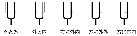 【実 験】 I おもりを付ける場所と振動数の関係 同じおもりを付けた場合,おもりを付ける場所によって振動数がどう変化するかを調べるために,以下のような位置に,2個のおもりを付けた場合の振動数を測定した。