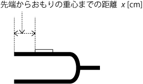 【考 察】 実験結果からは,今回のおもりの質量程度の場合,おんさの振動数はおもりの質量に比例して減少することがわかった。ただし,今回実験で使ったおもりの質量は1〜7gであったが,おんさの質量は約200gある。よって,おもりの質量をさらに大きくしていくと,振動数の変化の仕方が変わってくるかもしれない。今後,継続して研究を行っていきたい。 III おんさにつけたおもりの位置と振動数の関係 おんさにつけたおもり(2g)の位置を,先端から0.5cmずつずらしていき,それぞれの位置での振動数を測定する。