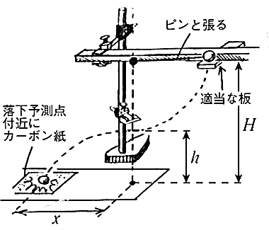 | 力学的エネルギー保存則の生徒実験としては,従来は,振り子の糸を最下点で切り,おもりに水平投射運動をさせて,水平到達距離を測るものがポピュラーであった。例えば,図1のような装置で,おもりの質量をm,はじめの高さをH,飛び出す位置の高さをh,飛び出す速さをv とすると, 力学的エネルギー保存則より, |