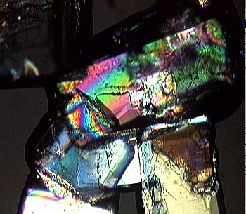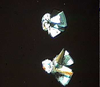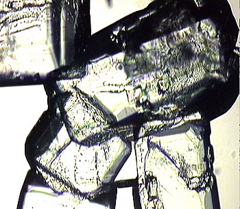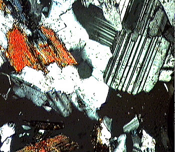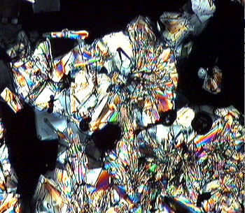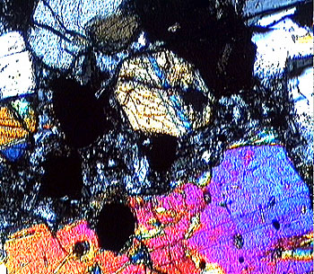クロスニコルで黒く見える部分は、アメ状(ガラス質:液体)の部分で、石基部分に相当し、まるで火山岩の斑状組織のように見える。