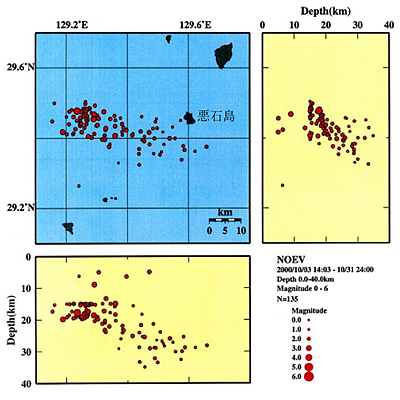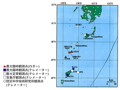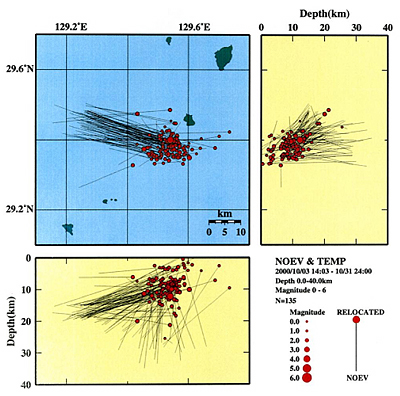 図1を見ると離島を除く地域には観測網が密に配置されている。しかし,離島には地理的な影響もあるが,観測網が貧弱であり,島によっては近辺の地震活動が盛んであるにも関わらず,地震計が配置すらされていない島もある。悪石島や宝島(AKUS・TAKT)もその1つである。そこで,NOEVでは2000年10月に悪石島で発生した地震活動についてより詳細な震源決定を行うために臨時地震観測を実施した。なお,AKUS・TAKTに限っては地震発生の2日後に地震計を設置したために本震の震源記録は得られていない。