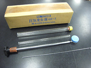 | 雲粒が発生するには,気体から液体への状態変化のきっかけとなる凝結核の存在が重要です。ペットボトルとFizz Keeperの実験で,凝結核として線香やマッチの煙を入れて再実験すると,煙を入れないときよりたくさんの雲粒ができることが観察できます。しかし,この実験の欠点は時間がかかることです。かなり頑張って空気を入れないと雲粒ができないので,同じ実験をくり返すことも手伝って間延びしてしまいます。 そこで,写真のような実験道具を利用しています。WARD'Sという教材会社の Cloud-Forming Apparatus という製品です。 http://wardsci.com/product.asp?pn=IG0004010