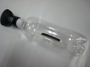 まず,温度が下がることを示し,次にFizz Keeperのポンプでペットボトルの空気を圧縮し,雲をつくる実験を行います。このとき,使用するペットボトルは必ず炭酸用のものを用いること。お茶などの普通のペットボトルだと破裂して怪我をする危険性があります。