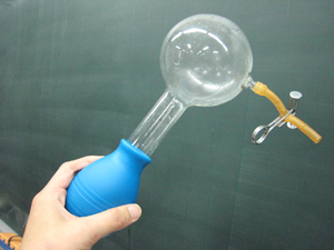 持ち手の部分を握ったり,緩めたりすることで,フラスコ内部に温度変化を生じさせて雲粒をつくろうというものです。ただ,フラスコの内側を水で濡らしただけでは,ニギニギしても雲粒はできません。ピンチクランプを外し,ぎゅっと握った状態でゴム管の所から線香やマッチの煙を入れてやると,ぱっと握り手を緩めた瞬間にフラスコ内に雲粒ができます。再び握ると内部が昇温して雲粒は消えます。このように非常に反応性がよいので,効果的に現象を見せることができます。