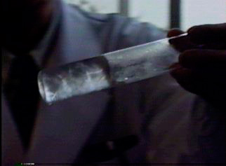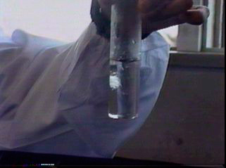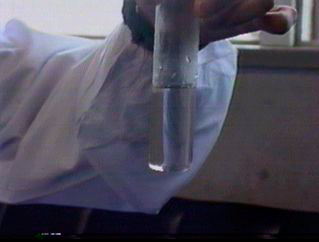 状態変化の「きっかけ」として,小さな氷粒を試験管に投げ入れます(図9)。すると,試験管の中の過冷却水はたちまち凍ります(図10)。