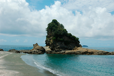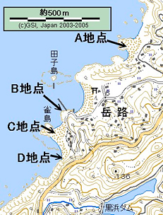 生徒たちはこのD地点付近の砂が、A地点や岳路海水浴場の砂の色と異なり緑色をしている理由がこの変はんれい岩にあることをすんなり理解できたようだった。また、砂(粒径1/16〜2mm)の色が自分らのイメージ(砂浜の砂の色や校庭砂場の砂の色)としてないものもあることを認識できたようだ。 |