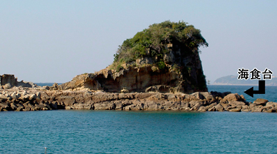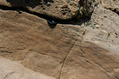 また、この地点には海食洞があり、干潮の時間をねらってこの場所を訪れると、海食洞を通り抜けることができる。いたるところで斜交葉理(クロスラミナ)が観察されるので堆積当時は水流の向きがよく変化する場所だったことがうかがえる。