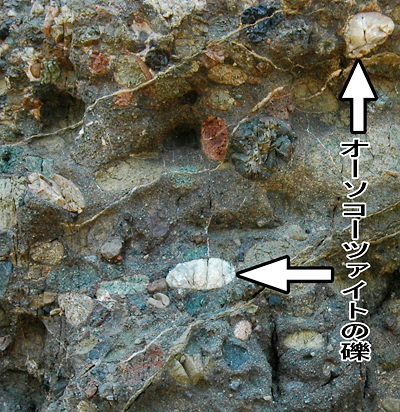 れき岩層中のオーソコーツァイト〔正珪岩〕に注目した。オーソコーツァイト〔正珪岩〕は石英の微粒子だけから構成されている岩石であり、砂漠などの大陸環境で形成されたといわれる石英砂岩である。日本での産出は全てれきとして発見されている。石英だけでできているので非常に硬いことをハンマーでたたくことで確認した。
