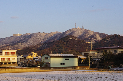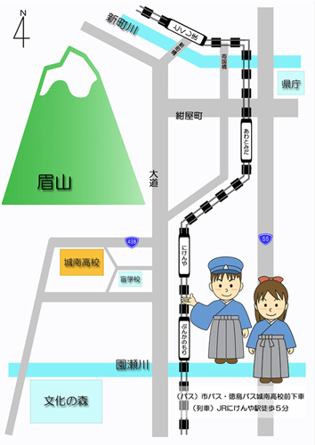 眉山(標高290m)は徳島市のシンボルの一つです。山頂部まで自動車道が通じるとともに,東麓の阿波おどり会館からロープウエイも運行する観光スポットで,山頂からは徳島平野とその夜景を一望でき,晴れた日は淡路島や紀伊半島も望むことができます。本校は眉山南麓に位置し,本校校歌冒頭でも『眉山の若葉陽に照り映えて』と歌われ,親しまれています。