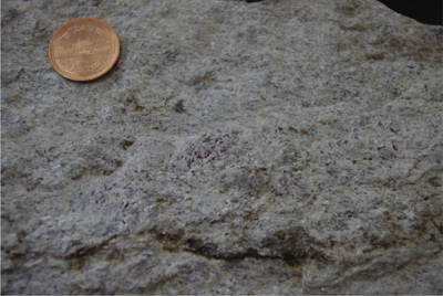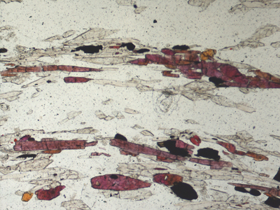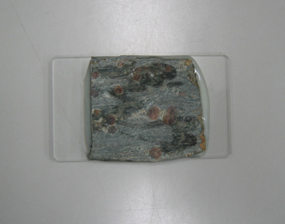 本校正門前の国道438号線を西進してすぐに,眉山パークウエイ入り口があります。パークウエイに入り,ため池の横を右折せず山頂方向に直進し,山の斜面を宅地造成した最上部まで行きます。少し藪をかき分け,落石防護柵の裏側に入ると露頭があり,その中にざくろ石を多く含む部分があります。この露頭は眉山の変成岩の中で,最も高温で変成作用を受けたものと考えられます。岩石の切断面を研磨すると,緑簾石の緑とざくろ石の赤とのコントラストが美しい石です。岩石を構成する鉱物としては,他に白雲母とバロア閃石などを含んでいます。