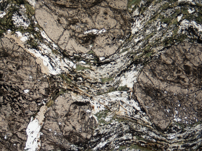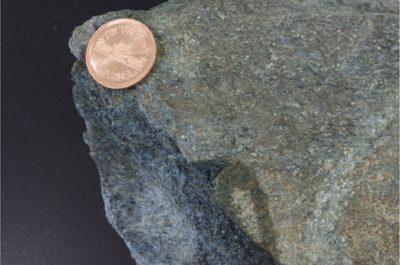 本校から見て山の反対側の北麓は,南側に比べてやや険しい地形になっています。ここでは斑点状の曹長石を含有する緑色の点紋塩基性片岩が多く見られます。眉山の三波川変成岩類は,北側の点紋帯と南側の点紋を含まない無点紋帯に分けられます。