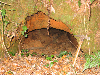 この露頭の近くにはかつて鉱石(小さなキースラーガー/層状含銅硫化鉄鉱床と思われます)を採掘していた直径1mほどの坑口が開いています。