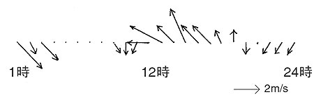 生徒は,海陸風を勉強するといつでも海陸風が吹いているように思ってしまう.しかし,風向に関しては実際には季節風や特に低気圧の影響が強く,海陸風が顕著にみられる日はそう多くはない.余裕があれば連続した数日分のベクトル図をかかせたほうがよい.