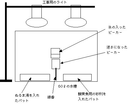 アメダスデータCD-ROMから鉾田の3月の風向風速データを抜き出し,海陸風が発生したと思われる日のデータをあらかじめ選んでおく. [2] 60リットルの水槽,バット2個,砂利(金魚などの水槽の底に敷くもの),ビーカー(50mlのものを底同士をくっつけておく),工事用ランプ2基,線香,お湯,氷,工事用ランプを支えておくためのスタンドのようなもの |