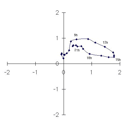 また,発展的な学習として,ホドグラフ(図3)を書いてみると風向の変化のパターンがわかる(観測地点によって,時計回りのところと反時計回りのところがあることがわかる). ただし,きれいなホドグラフがかける日は1年間のうちでも数日あるかないかくらいであるから,データを探すのが大変である.また,クラブ活動などで関東地方から長野県にかけて酸性雨の調査をしているような場合,酸性雨とこの地域の海陸風との関わりを調べてみるとおもしろいデータが得られるかもしれない. |