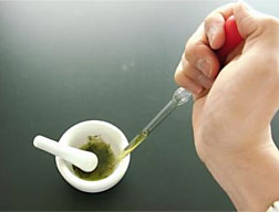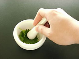 | 2−1.同化色素の抽出 (1)シソの葉をちぎって乳鉢に入れ、エタノールを加えて押しつぶす。