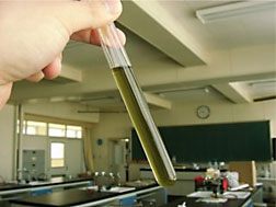 | この実験は特にめずらしいものではないが、ペーパークロマトグラフィーと併せて行うことで、同化色素の働きと種類に対する理解を容易にすると考え、本校では2年次に実施している。 この実験の後に、光合成で利用していない光の色(波長)が反射・透過して目に入るため、葉が緑色に見えていることを説明している。 様々な現象が密接に関連して、自然現象が成立している。このことを常に意識して、今後も授業を行いたいと考えている。 |