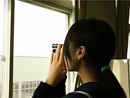 (2)手順1で試験管に収集した同化色素越しに、直視分光器を使い吸収スペクトルを観察する。