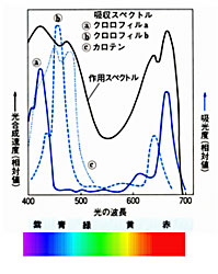 同化色素越しに見たスペクトルで消えてしまった色の部分と、グラフにおける各同化色素の吸光度が高い部分を対応させ、光合成に利用されている光の色(波長)を理解させる。 |