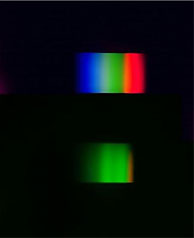 ※この同化色素の抽出を、メタノール:アセトン=3:1の混合液やジエチルエーテル等を使って行うと、抽出液はそのままペーパークロマトグラフィーに使用できる。 2−2.スペクトルの観察 (1)直視分光器を使って、自然光のスペクトルを観察する。
